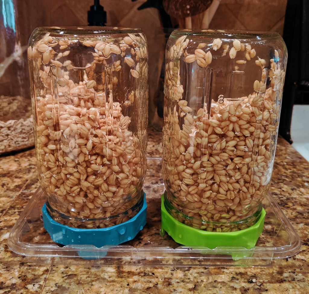 In case you can’t order lids (or you’re too anxious to wait for them to arrive), you can wash your wheat in a colander and then soak in water overnight. The next day, drain the wheat in the colander and give it a rinse. Transfer it to a jar and cover the jar opening with a few layers of cheesecloth secured with a rubber band. You can’t leave the jar directly upside down because the berries need air flow, so you need to prop the jar upside down and slightly tilted. You can do this by leaning the jar on the inside of a heavy bowl or a dish drying rack. You will need to remove the cheesecloth and rinse your wheat in a colander morning and evening for a couple days. It’s bit more of a pain, but this way you can try it without committing.