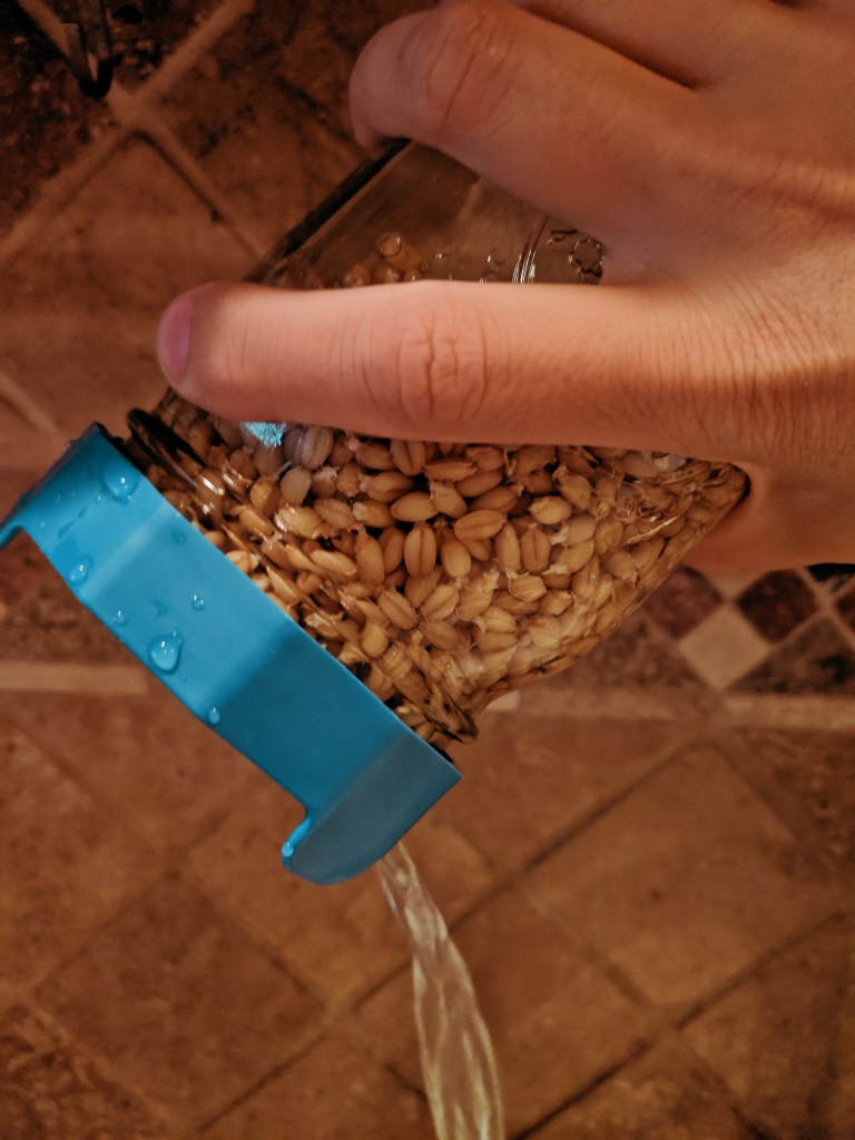 Drain and Rinse: Sometime the next day, pour the water off (use it to water your plants, there’s good stuff in there), and then rinse the wheat again. This time, leave the jar upside down on the counter to let it drain.