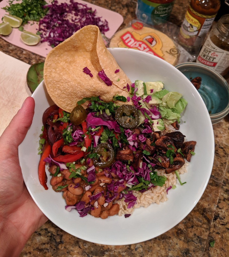 These beans make fantastic bean burrito bowls. My favorite way to eat them is with a scoop of brown rice, sautéed onions and peppers, mushrooms sautéed with a little tamari and balsamic, shredded purple cabbage, fresh cilantro, chopped tomatoes, corn, avocado, and lime! Sometimes we wrap all these ingredients in a flour tortilla. Sometimes I eat them with corn chips or an oil-free tostada. (For how to make an oil-free tostada in your toaster at home, click here and skip to 2:49/9:25.)