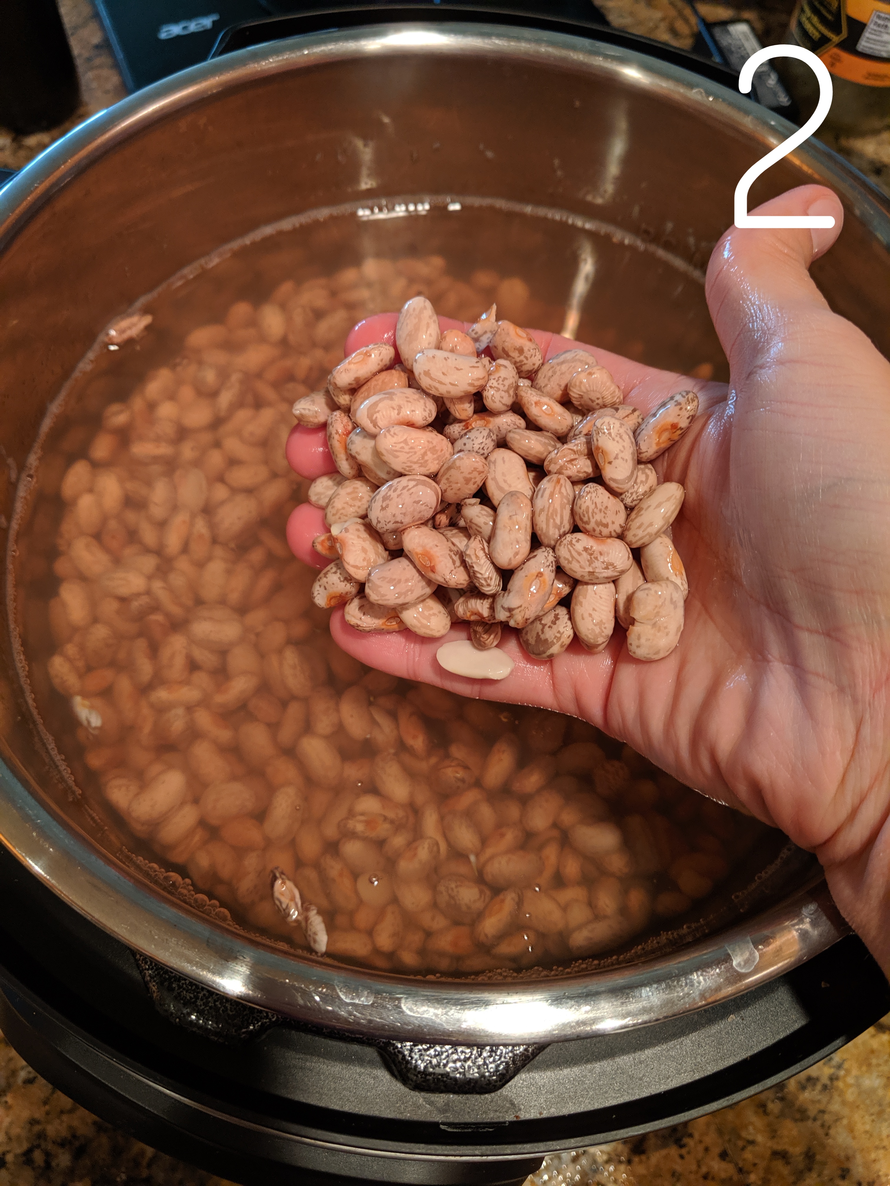 Wash and soak the dried pinto beans in LOTS of water for 8+ hours. I do this right in the Instant Pot. Your beans should look like pebbles in the bottom of a lake. It gives the beans plenty of room to swell up. They are going to double in size as they take in water, so add a lot more water than you think you need. After 8 hours, pour off the soaking liquid and rinse the beans in a colander. I often put the beans to soak before bed, and I cook them the next morning or afternoon. You can also soak them in the morning and cook them in the evening.