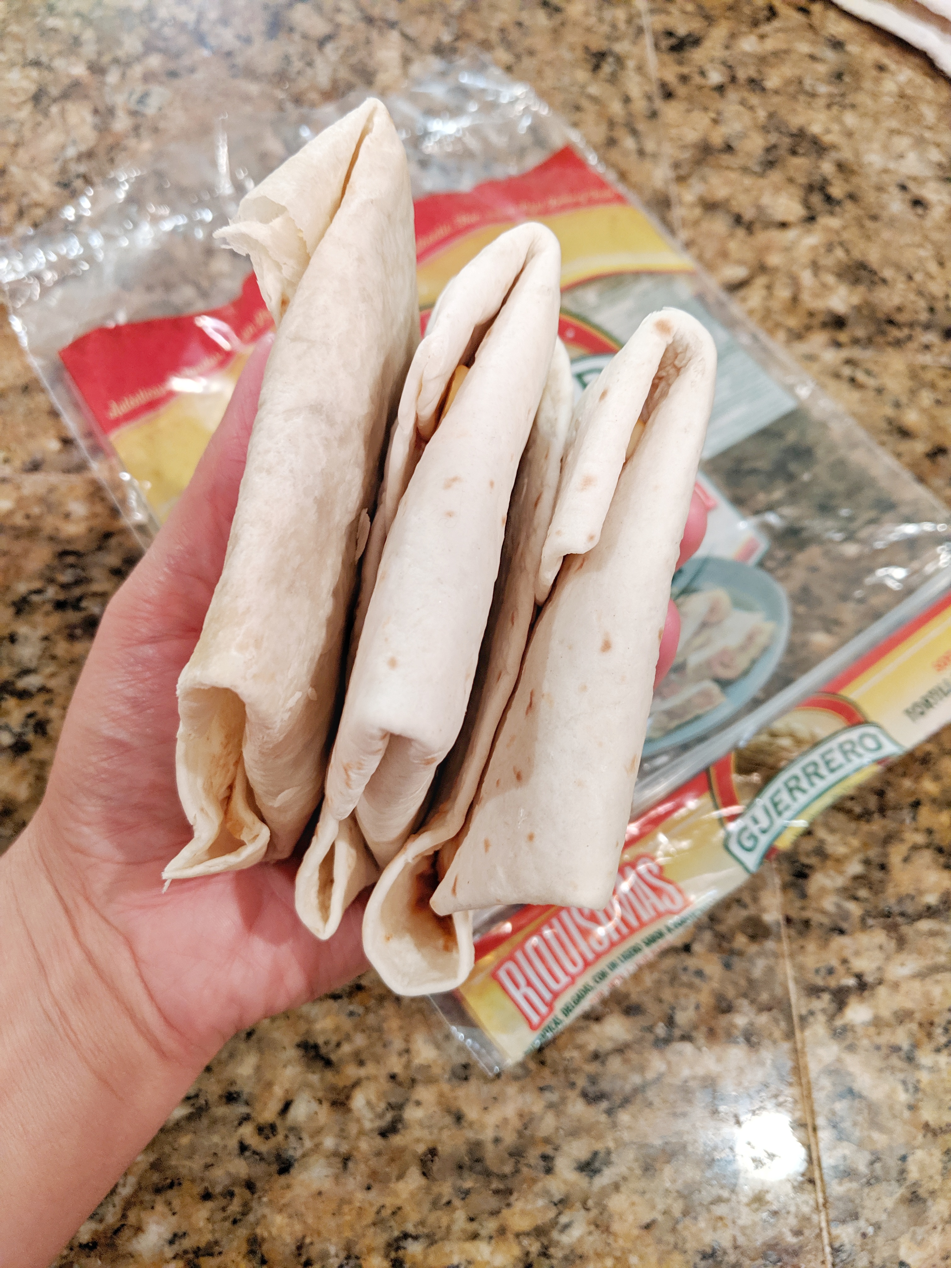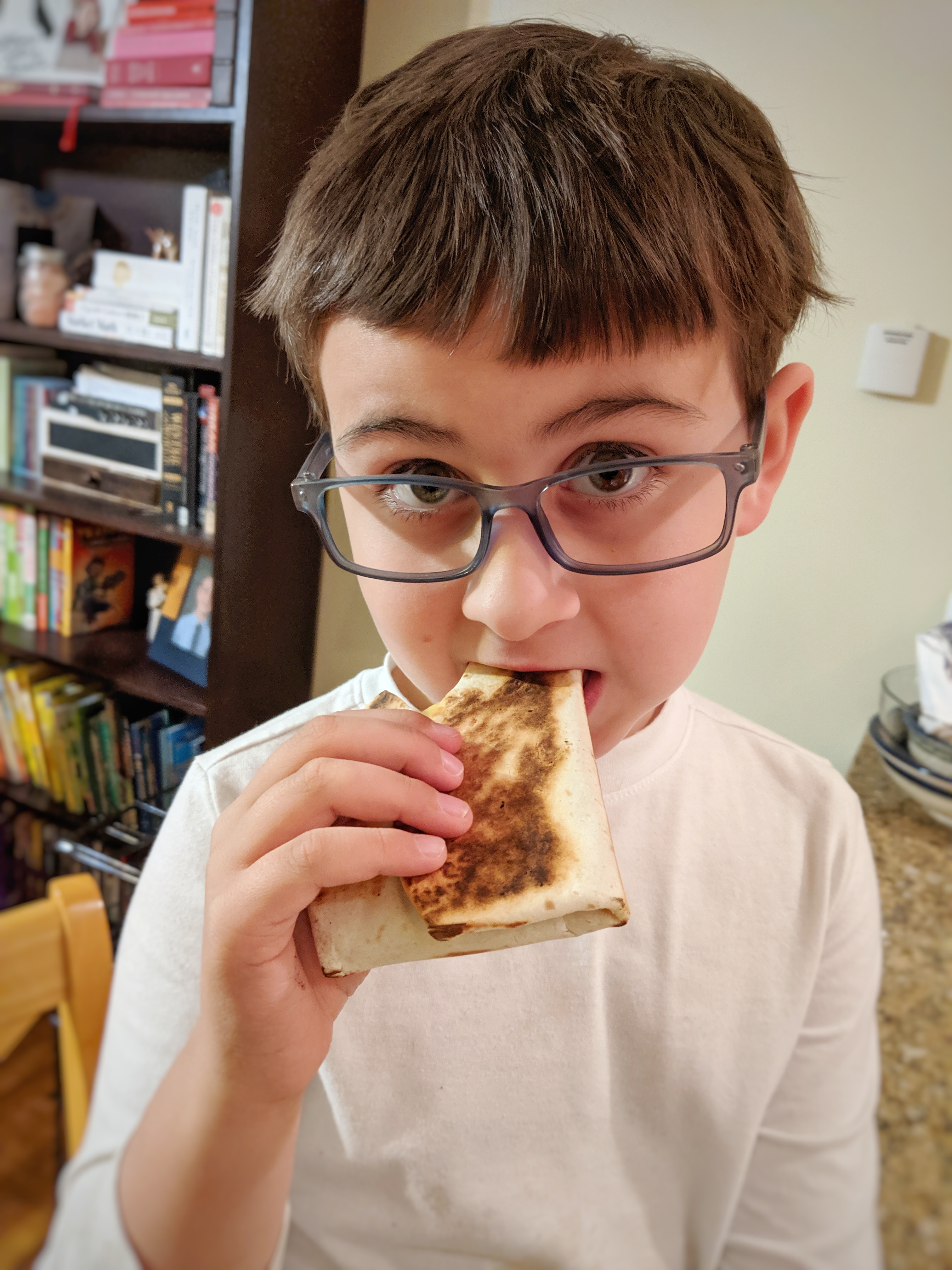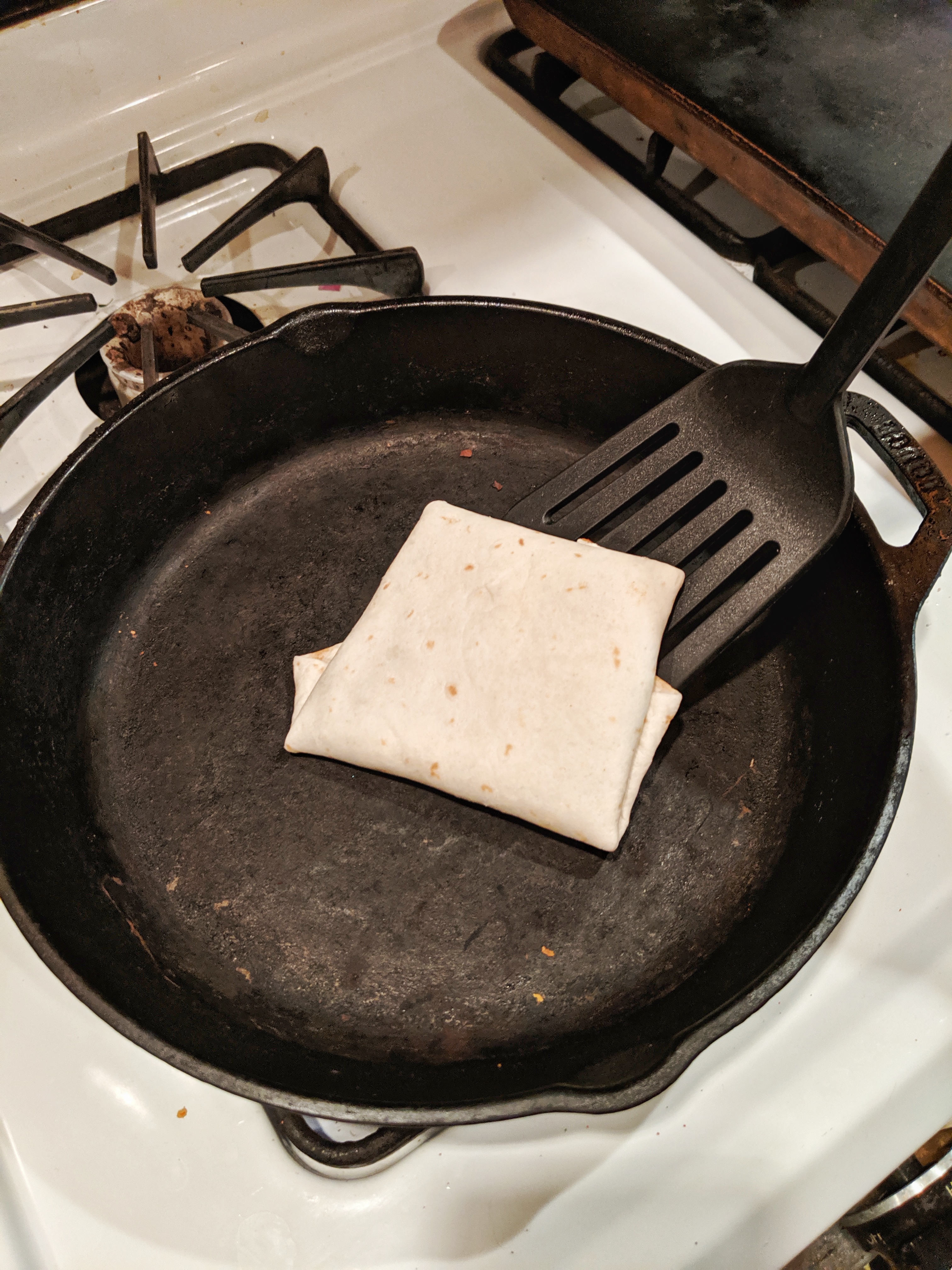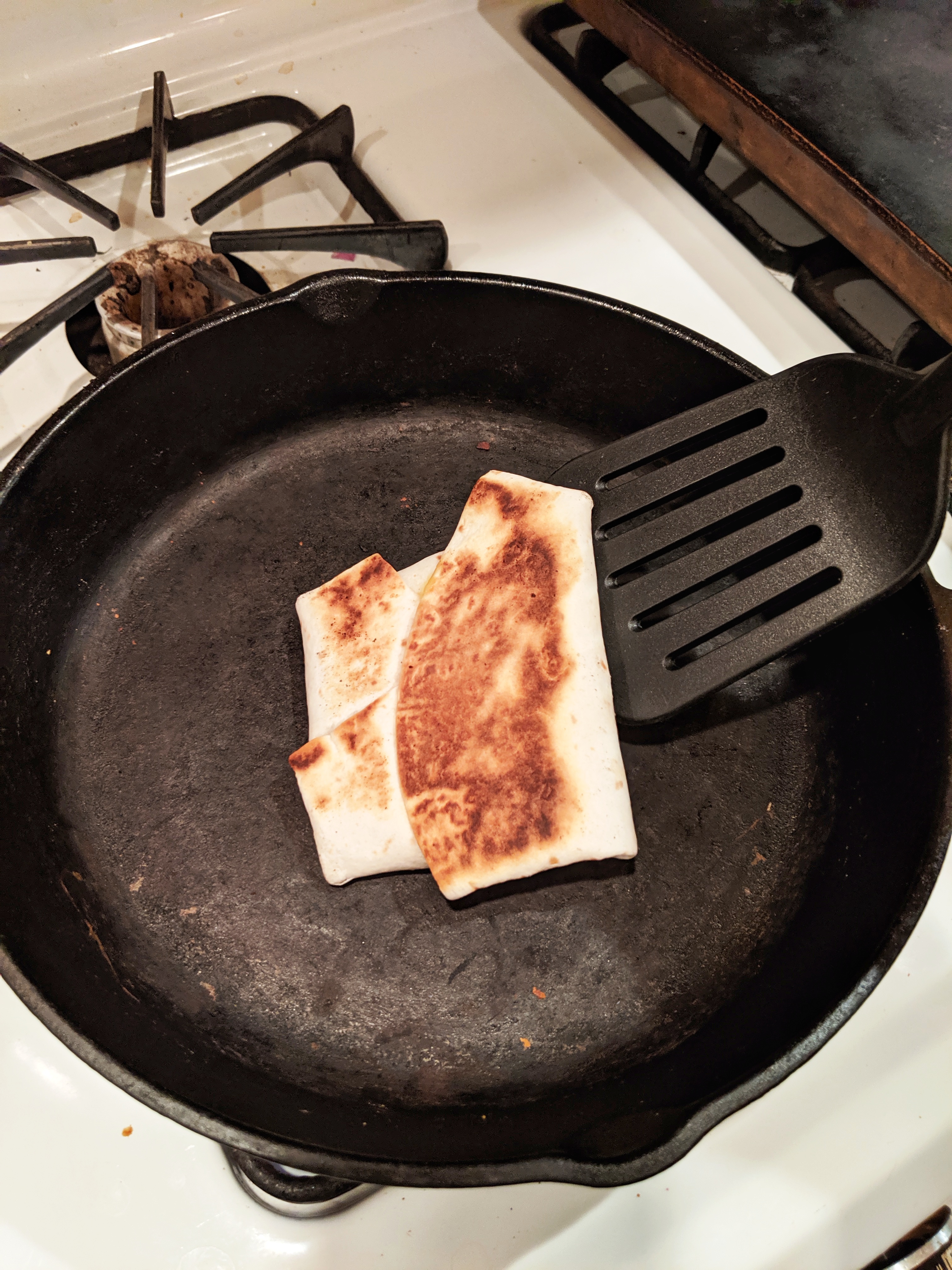 To make life easier, assemble 5 or 6 burritos at once, stack them, and store them in a bag in the fridge. For a quick kid-meal any time of day, pop a burrito in the frying pan to brown both sides and warm it through. I like to put a little piece of cheese on the fold during assembly so that it glues the burrito together when it melts.