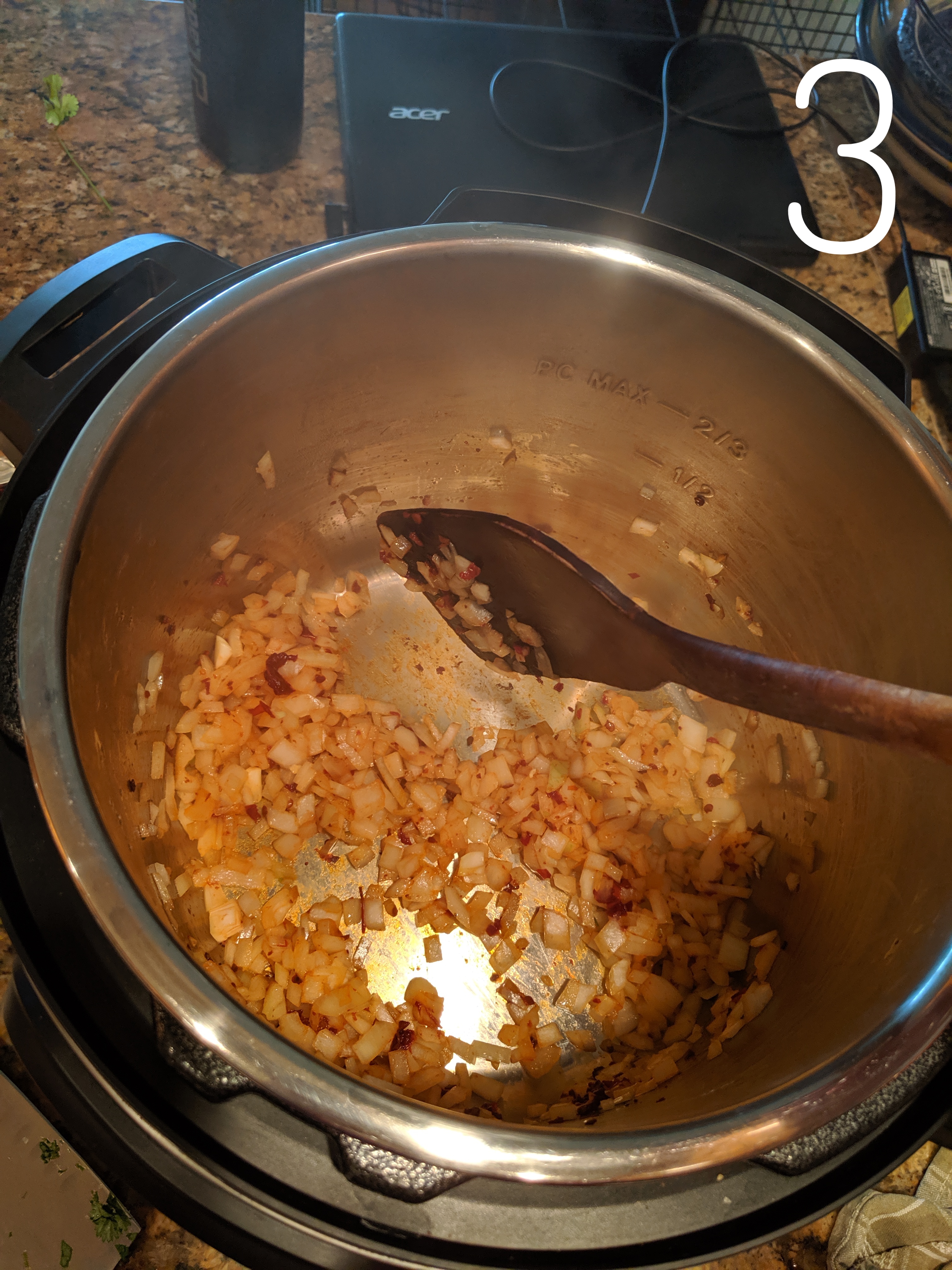 Using the sauté function on your Instant Pot, sauté the onion in the bottom of the pot until it turns translucent and starts to brown. Deglaze the pot with a little water or broth when the onion starts to stick and use a spoon to loosen up the brown bits. Add the chopped and saucy chipotle peppers and the chopped cilantro. If you like, add some extra Adobo sauce from the can of peppers. Mix that up and let it cook for a minute. Add the ground cumin and the soaked beans. Stir the beans to coat them in seasoning. Press cancel.